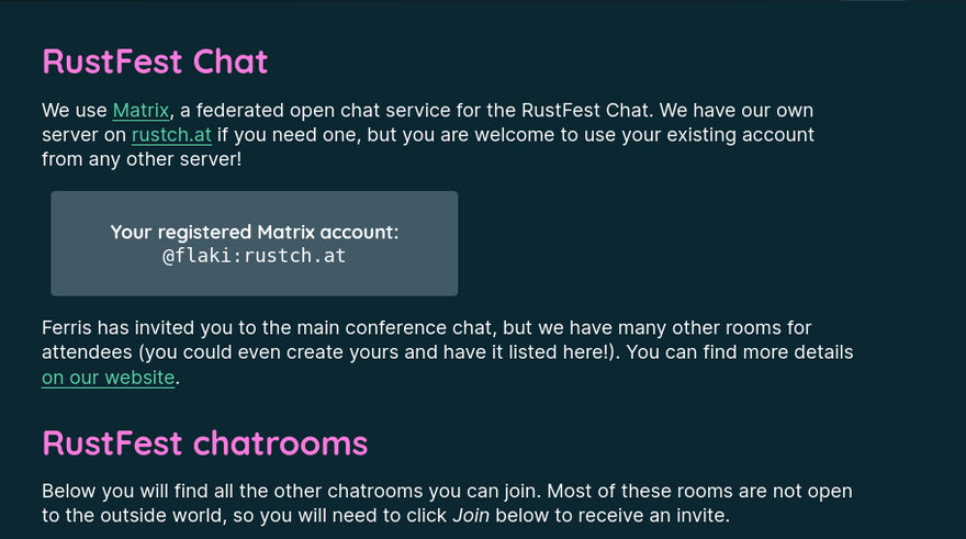 Months ahead of this, in November last year we also used the Matrix network to power RustFest Global's chat experience through our own custom integration and our own RustCh.at Matrix server instance.