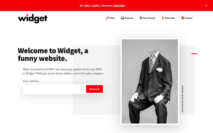 Widget (formerly Spooky), set out to a) bootstrap a silly and left-leaning humour site; b) be a leading web publisher with regard to equity and inclusivity; c) be a leading web publisher with regard to ethical, anti-exploitative business models.