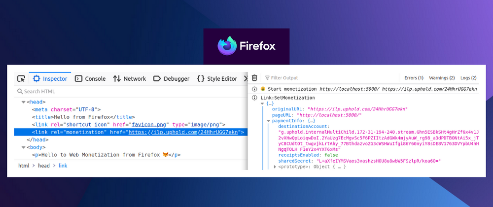 Once the WM community reached consensus to to go with the <link>, I proceeded to implement this declarative API in a fork of Firefox at GitHub. Note that the present implementation only handles the fetching and processing of the monetization endpoint (payment pointer), and not the actual monetization.