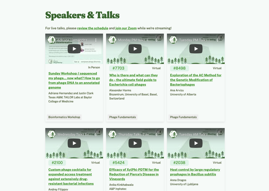 Through our community-building efforts, we were approached by the Phagebiotics Research Foundation (https://www.phagebiotics.org) to be the technical partner for the Evergreen Meeting (https://evergreen.phage.directory). Evergreen, one of the major academic organizations in phage research, wanted to run a hybrid conference for phage researchers internationally, which we'd never run (or attended) before.