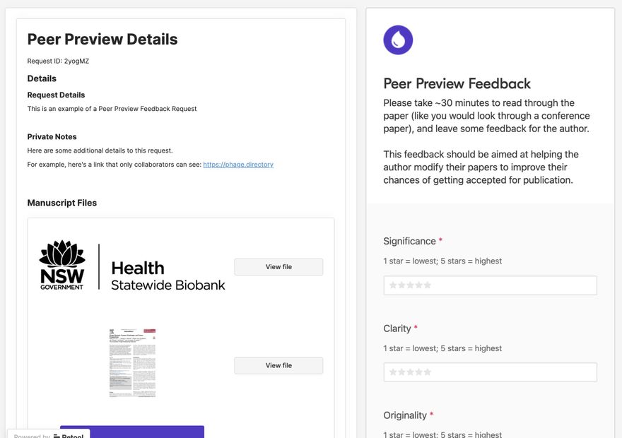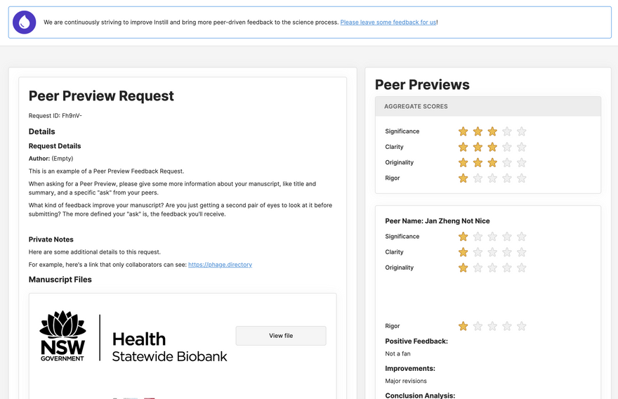 The Peer Preview system starts out as a request from a manuscript author. Members of Instill respond to the Peer Preview request, and if selected, give the author structured feedback through the feedback form. As part of this system, we developed the "SCOR Card" system to help researchers quickly assess papers across significance, clarity, originality, and rigor, based on this paper: https://arxiv.org/pdf/2109.09774.pdf. Requesters are given a dashboard where they can monitor the feedback as it rolls in.