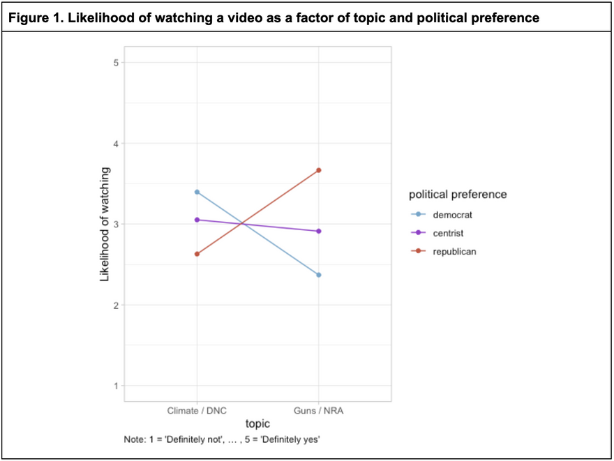 To study this question from another angle, we also measured how people’s political preferences affect their likelihood of watching videos from certain creators. The results here strengthen our previous findings. As shown in Figure 1, when asked if they would watch a video about climate change published by the DNC (Democratic National Committee) official YouTube channel, democrats replied positively and republicans negatively. However, as expected, when the topic was gun regulation and the publisher the NRA (National Rifle Association), republicans responded more favorably and democrats negatively.