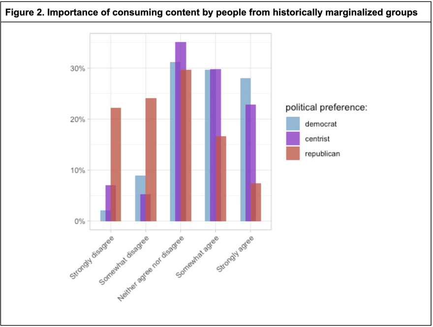 Next, we wanted to learn if people are sensitive to the identity of content creators and whether they belong to a historically marginalized group. To study this, we measured their rate of agreement with the statement: "It is important to me to read articles and watch videos created by people from historically marginalized groups (groups excluded due to race, gender identity, sexual orientation, age, physical ability, language, and/or immigration status)".