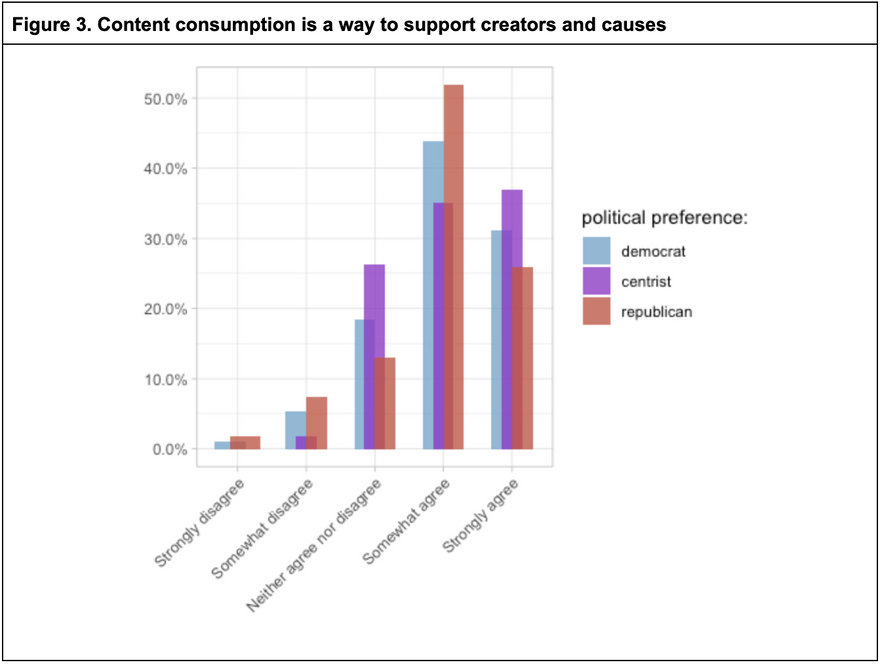 Most people in our survey see online content consumption as a way of supporting creators and causes they care about. Over 75% of the participants agreed with the statement: "By reading articles and watching videos, I show my support to the creators and the causes they promote". Figure 3 shows this was true regardless of people’s political preferences.